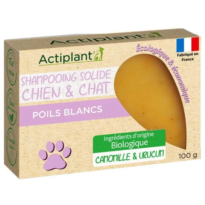 Se stai cercando uno shampoo particolarmente adatto al pelo chiaro del tuo cane o gatto, scegli lo shampoo solido per pelo bianco di Actiplant. Questo shampoo è un’ottima alternativa ecologica per lavare il tuo animale con ingredienti naturali e rispettosi della sua cute