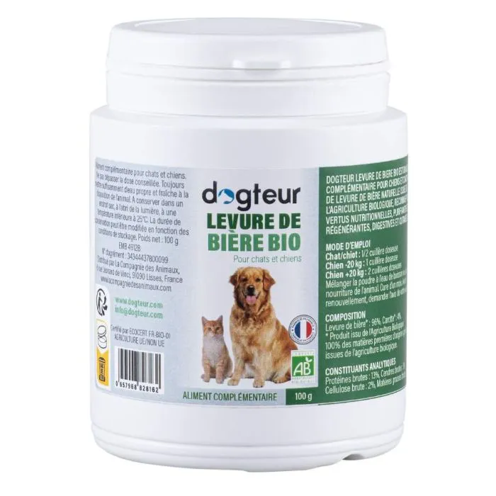Dogteur Lievito di birra Bio è un integratore alimentare per cani e gatti, ricco di vitamine del gruppo B (tra cui B1 ma anche B5, B6, B8 e B9), aminoacidi e minerali raccomandati per la buona salute del tuo animale.