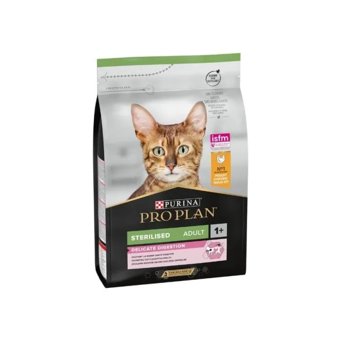 Purina Proplan Sterilised Adult Delicate Digestion è un alimento completo al pollo per il mantenimento della buona salute dei gatti sterilizzati.