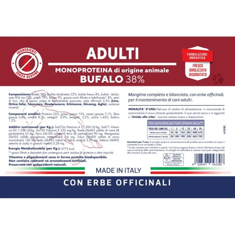 La carne di bufalo offre una proteina Ipoallergizzante perché mai adoperata prima d’ora nella alimentazione del cane. Formula olistica utilizza una sola fonte proteica: carne di bufalo disidratata ed una fonte glucidica senza i glutini allergizzanti e lieviti.