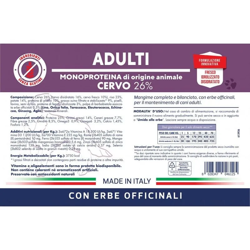 Cervo 26% (cervo disidratato 16%, cervo fresco 10%), riso 23%, patate 14%, proteina di pisello 10%, grasso suino filtrato e stabilizzato* 9%, piselli, favino, semi di lino, proteine di fegato idrolizzate 3%, polpa di barbabietola essiccata, erbe officinali 0,5% (Lino, Ortica folia, Tarassaco, Eleuterococco, Echinacea, Ginseng, Aglio), sostanze minerali.