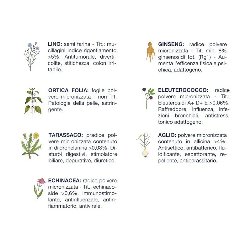 Integrata con sette erbe officinali titolate che aiutano a prevenire parassiti, infezioni batteriche e virali, disturbi digestivi, tumori.