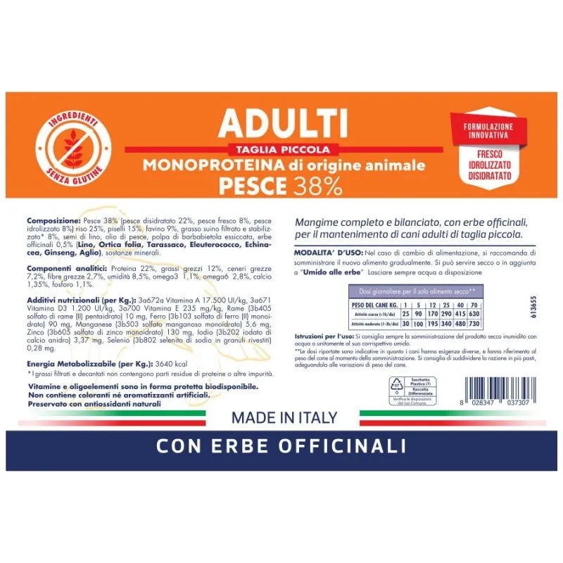 Composizione: Pesce 38% (Pesce disidratato 22%, Pesce fresco 8%, Pesce idrolizzato 8%), riso 25%, piselli 15%, favino 9%, grasso suino filtrato e stabilizzato* 8%, semi di lino, olio di pesce, polpa di barbabietola essiccata, erbe officinali 0,5% (Lino, Ortica folia, Tarassaco, Eleuterococco, Echinacea, Ginseng, Aglio), sostanze minerali.