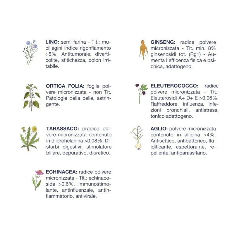 Integrata con sei erbe officinali titolate che aiutano a prevenire parassiti, infezioni batteriche e virali, disturbi digestivi, e innalzano le difese immunitarie.