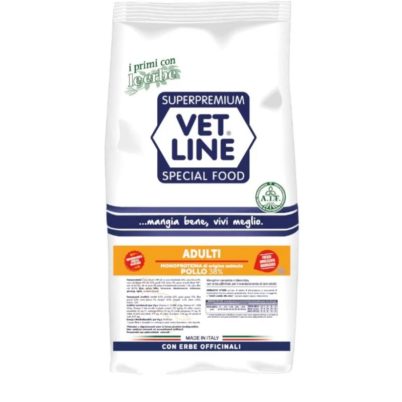 Pur essendo destinata a cani che non manifestano intolleranze alimentari, è stato seguito anche in questa formula il concetto di alimentazione olistica di tutta la linea Vet Line, utilizzando una sola fonte proteica: pollo fresco e disidratato ed una fonte glucidica senza i glutini allergizzanti e lieviti.