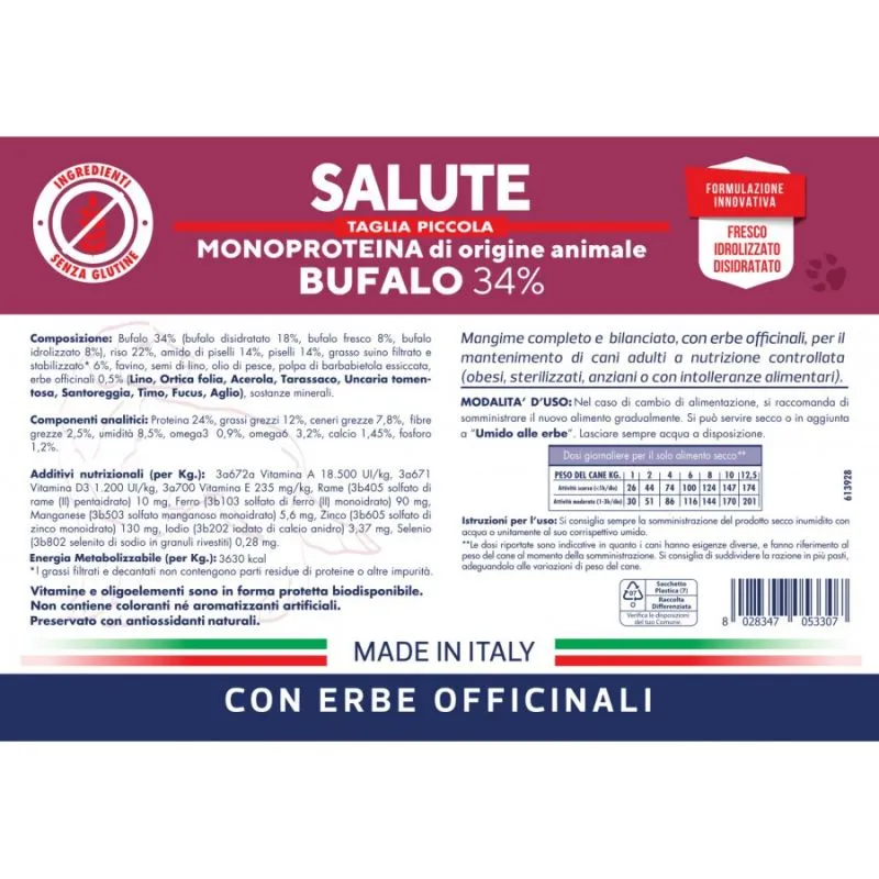 Composizione: Bufalo 34% (Bufalo disidratato 18%, Bufalo fresco 8%, Bufalo idrolizzato 8%), riso 22%, amido di piselli 14%, piselli 14%, grasso suino filtrato e stabilizzato* 6%, favino, semi di lino, olio di pesce, polpa di barbabietola essiccata, erbe officinali 0,5% (Lino, Ortica folia, Acerola, Tarassaco, Uncaria Tomentosa, Santoreggia, Timo, Fucus, Aglio), sostanze minerali.