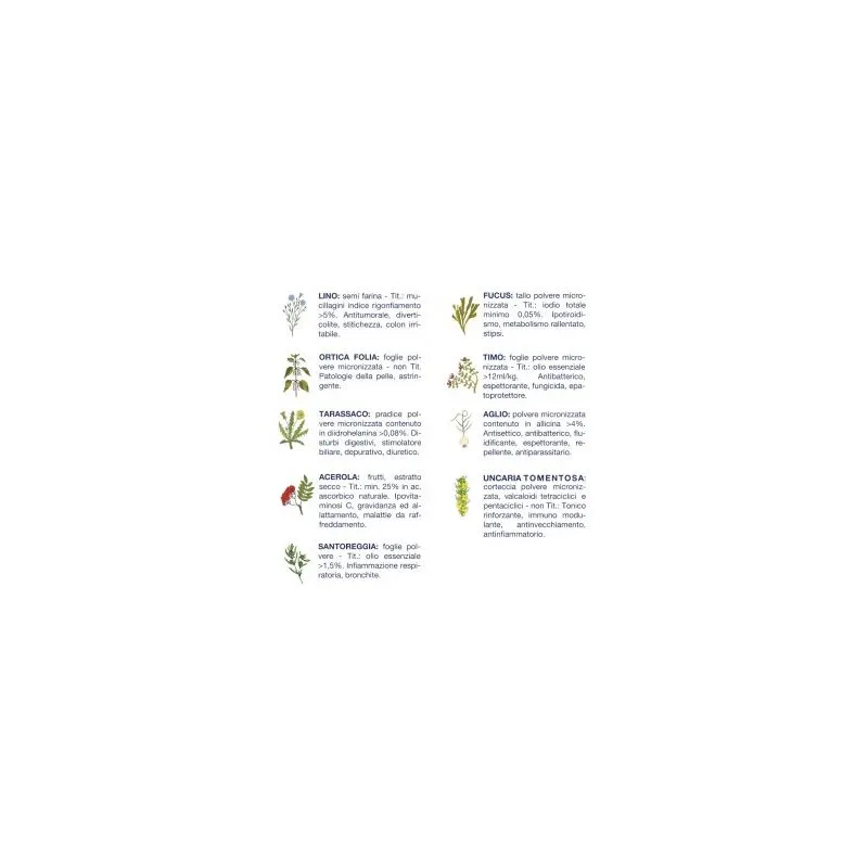 Integrata con erbe officinali titolate che aiutano a prevenire parassiti, infezioni batteriche e virali, disturbi digestivi: