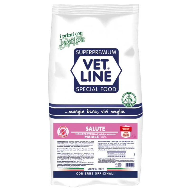 E’ stato seguito anche in questa formula il concetto di alimentazione olistica che caratterizza  tutta la linea Vet Line, utilizzando una sola fonte proteica: carne di Maiale Italiano disidratata e fresca ed una fonte glucidica senza i glutini allergizzanti e lieviti.